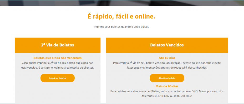 Você pode pegar o seu boleto no site da GNDI Minas na aba de Área do Cliente. No site oficial: https://www.gndiminas.com.br/