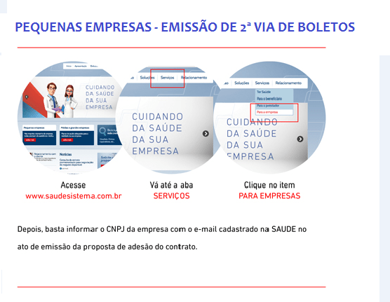 A segunda via do boleto está disponível no site da SAUDE SISTEMA. O cadastro é realizado com o CNPJ da empresa.
