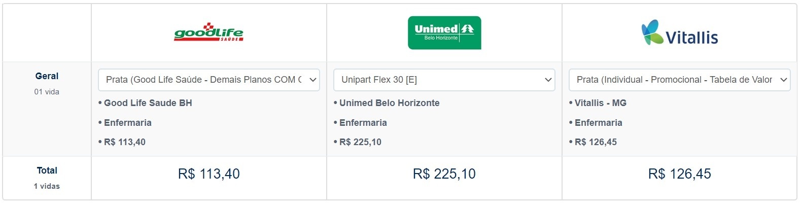 Comparativo entre os Planos Good Life, Unimed e Vitallis com cobertura ambulatorial e hospitalar, coparticipativo e acomodação enfermaria.