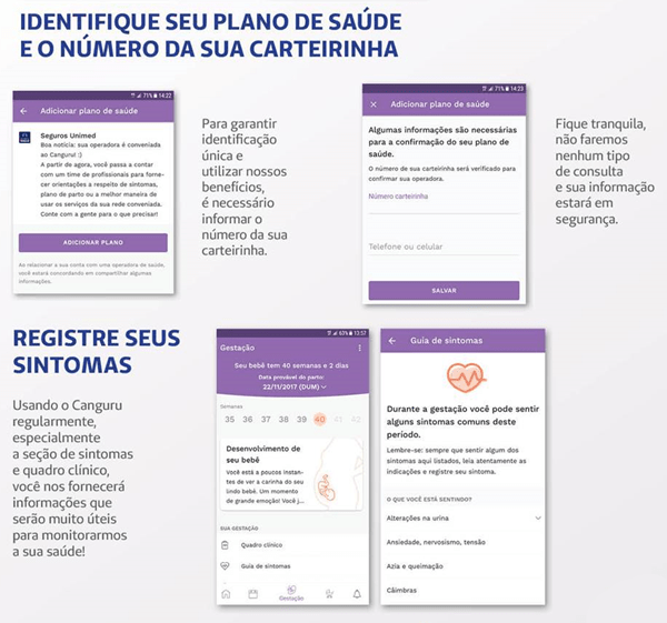 O objetivo da Seguros Unimed é cuidar de você cada vez mais perto. Por isso, trazemos uma novidade para as gestantes seguradas: uma parceria com o aplicativo Canguru Gravidez. A partir dele, é possível monitorar remotamente sua gravidez, detectando antecipadamente e rapidamente situações que possam representar risco para você ou seu bebê.