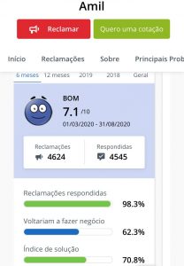A Amil possui boa reputação no Reclame Aqui, site que registra reclamações dos clientes, bem como o retorno das empresas. Presente há 11 anos na plataforma, a Amil apresentou apenas 8 mil reclamações no último ano – sendo essas todas respondidas. Confira a nota da Amil referente aos últimos seis meses: