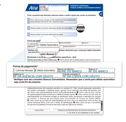 Para os novos contratos, no momento do preenchimento da proposta contratual, no campo “Forma de Pagamento”, marque a opção “débito automático” e preencha os dados completos.