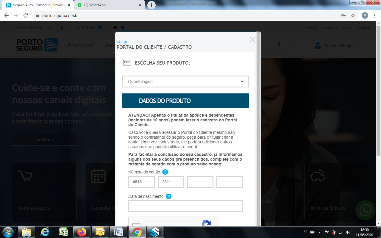 Escolher o produto “Odontológico”, informar os números que faltam da carteirinha do beneficiário e a Data de nascimento e clicar novamente na opção de segurança do “re-CAPTCHA”, depois em “Avançar”.