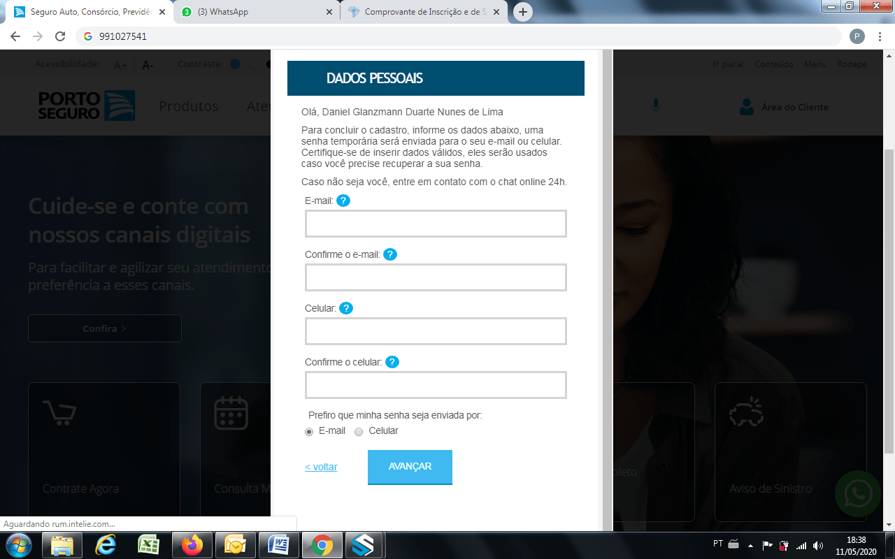 Informar “E-mail”, “Confirmar o e-mail”, “Celular”, “Confirmar o Celular”. Selecionar se quer que o código provisório para acesso seja enviado por “E-mail” ou no “Celular” e clicar em “Avançar”