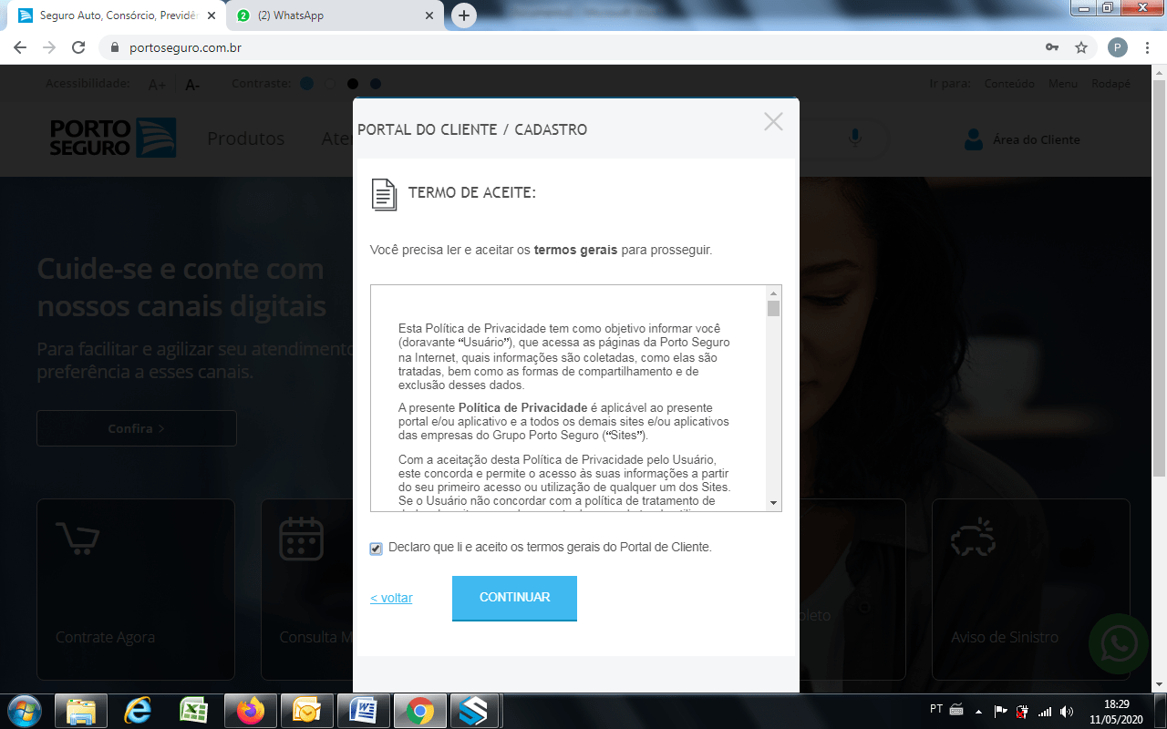 Vai aparecer o “Termo de Aceite”, é necessário selecionar “Declaro que li o aceite os temos gerais do Portal de Cliente” e clicar em “Continuar”.