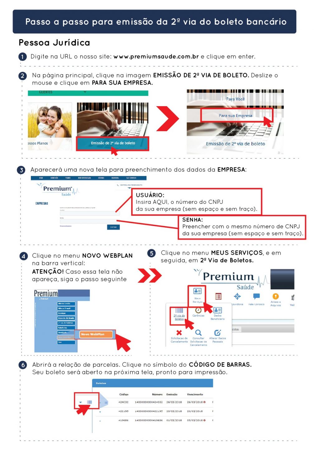 A partir de hoje as empresas clientes da Premium Saúde poderão emitir a 2ª via dos boletos bancários através no portal da operadora, seguindo o passo a passo: