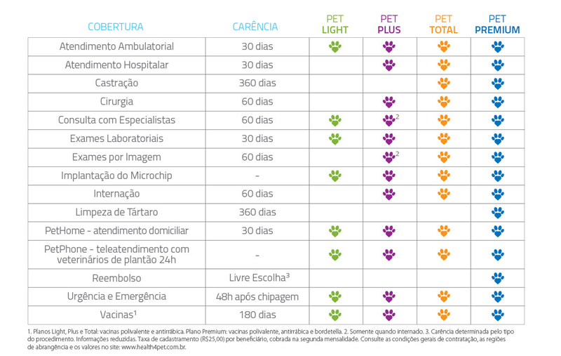 * Pets com doenças pré-existentes: Podem aderir ao plano, mas o tratamento de tais doenças ou males não terão cobertura.